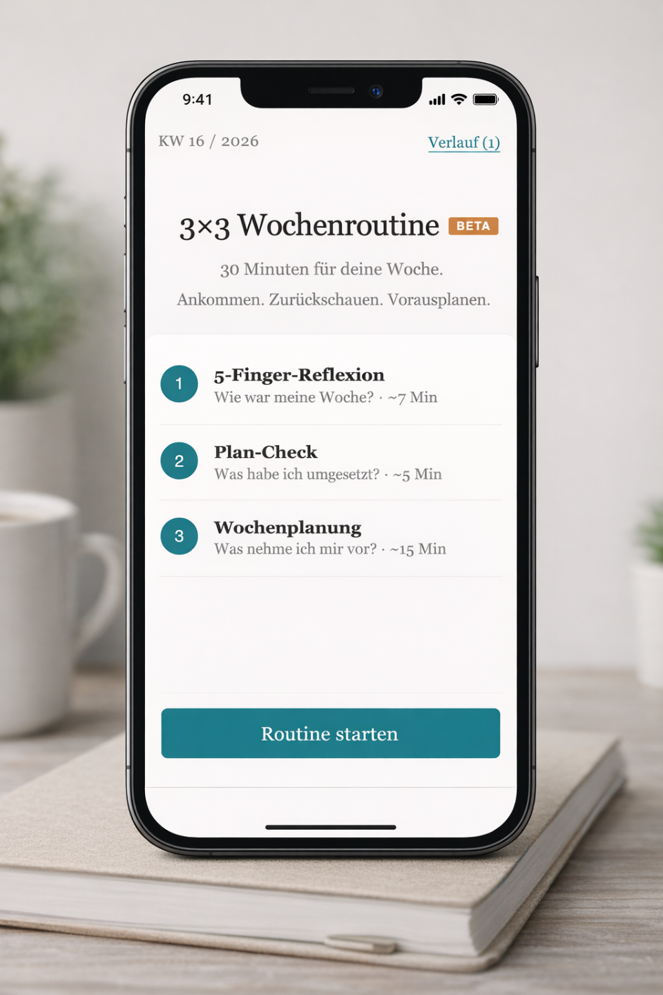Die 3×3-App macht das zur wöchentlichen Praxis — 30 Minuten, die Struktur und Klarheit schaffen.